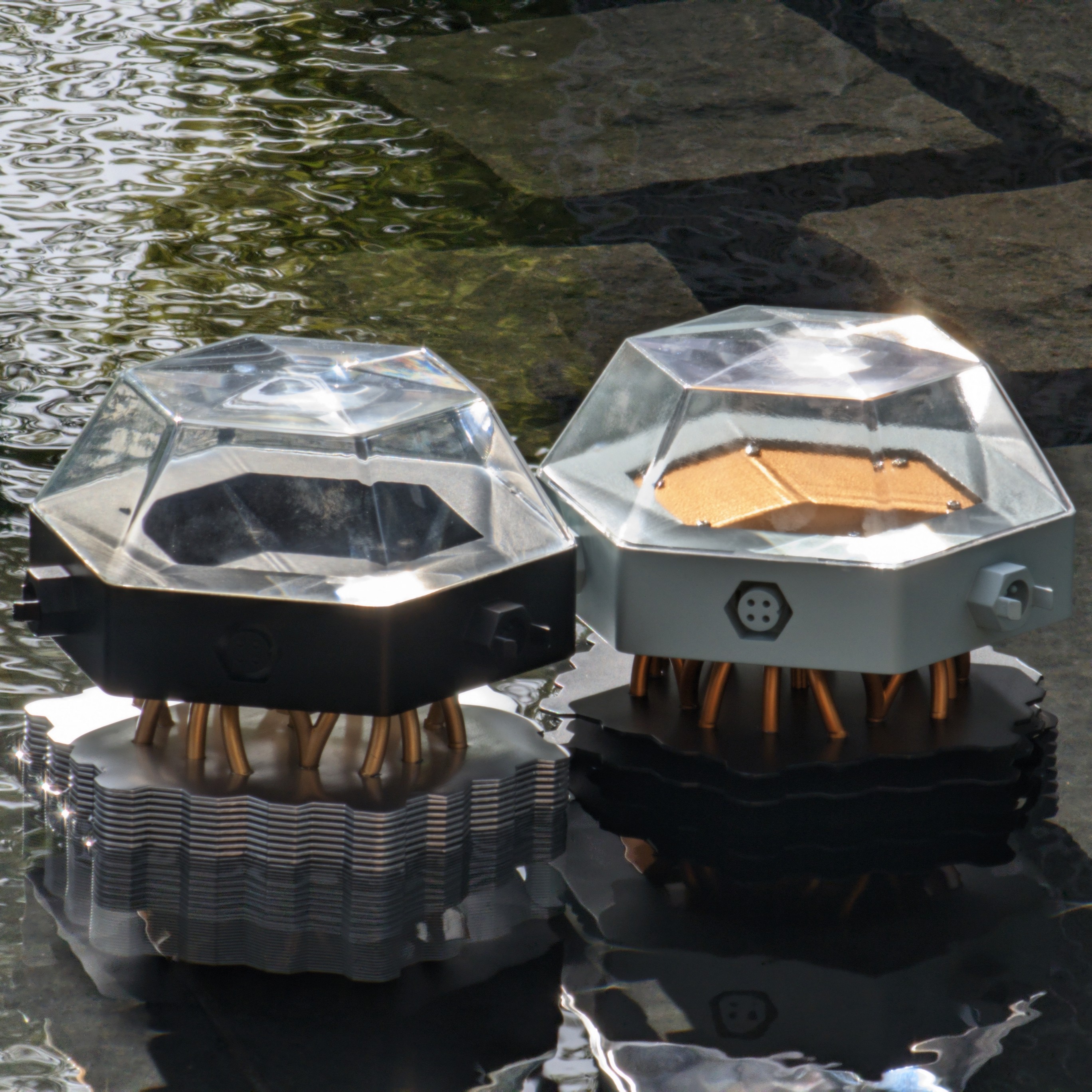 The Thermal Floater is a device that converts solar-thermal energy into electricity while floating on water. It’s a modular device that leverages the massive temperature difference between the sun's concentrated, raw heat and the cool water it floats on - using our novel lens and semiconductors - to deliver three times the power density of the solar PVs that exist today for a fraction of the cost.
